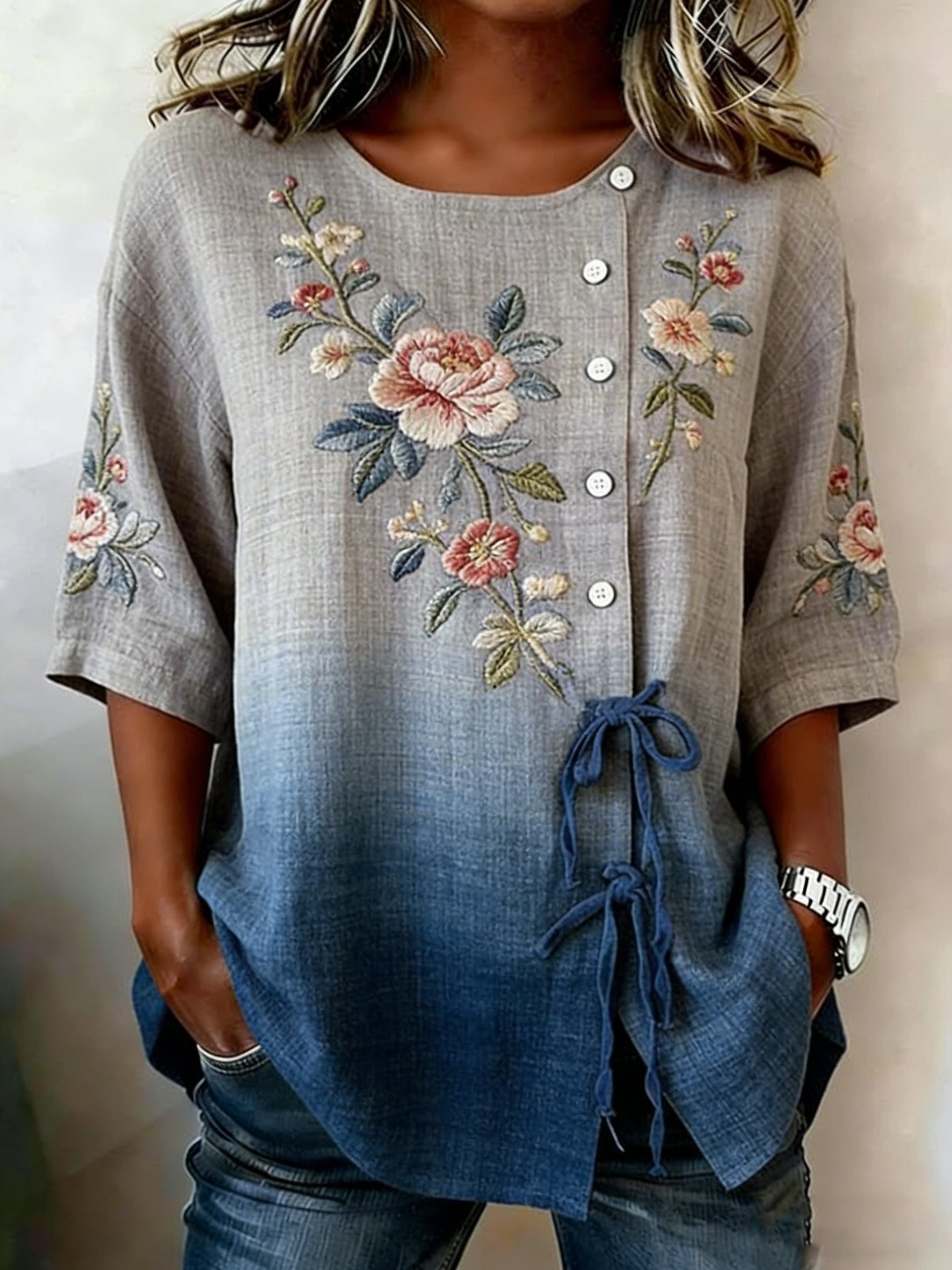 Damen-Hemd mit Blumen knöpfen aus Leinen mischung